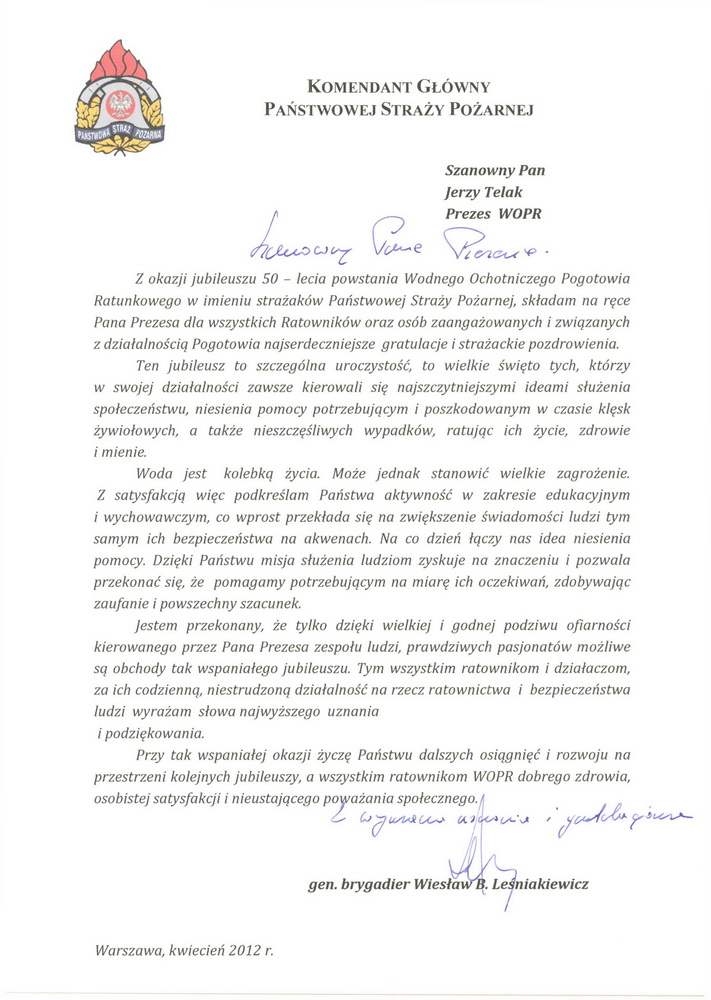 Komendant Główny Państwowej Straży Pożarnej gen. brygadier Wiesław Leśniakiewicz