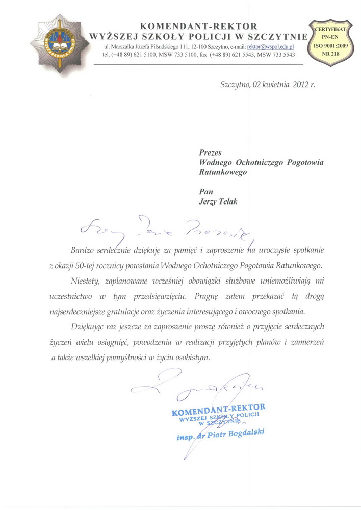 Komendant-Rektor Wyższej Szkoły Policji w Szczytnie insp. dr Piotr Bogdalski