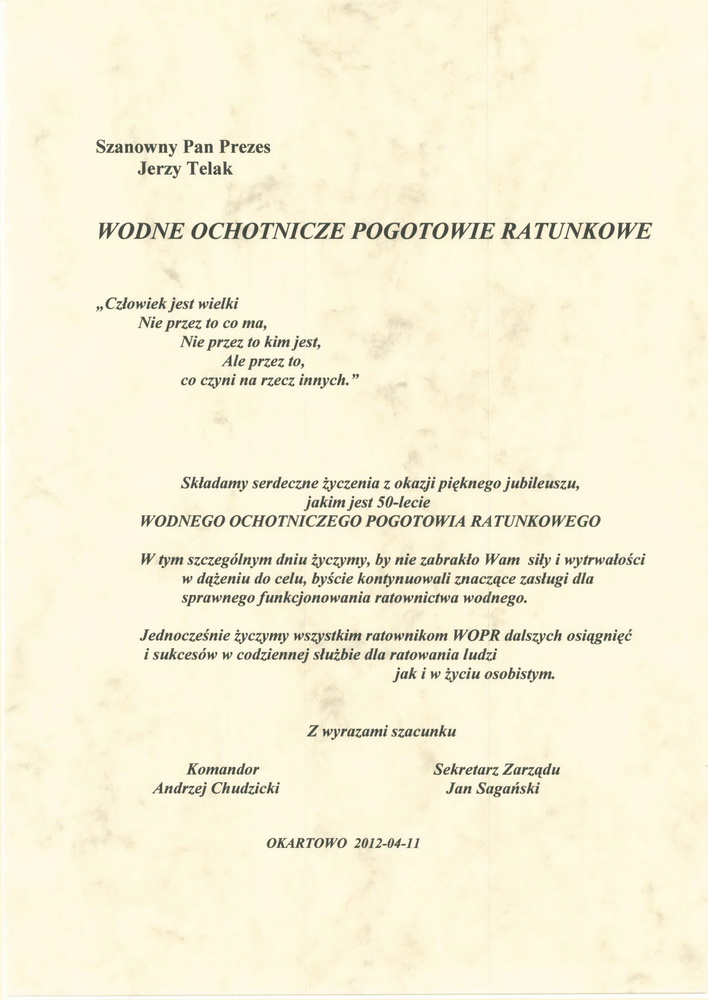 Mazurska Służba Ratownicza Komandor Andrzej Chudzicki Sekretarz Zarządu Jan Sagański